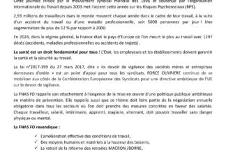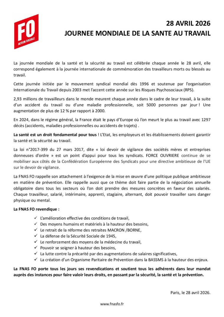 AccueilVie syndicaleVie syndicaleévenements28 AVRIL 2026 JOURNÉE MONDIALE DE LA SANTÉ AU TRAVAIL Le 28 avril 2026 Sur le même sujet29 avril 2026évenements26ème Congrès Confédéral de DIJON – Résolutions Adoptées –27 avril 2026évenementsSuite du Congrès FO : élection des instances confédérales14 avril 2026Vie fédéralePour l’augmentation générale des salaires, il y a urgence à attribuer des moyens à hauteur des besoinsTous les articles