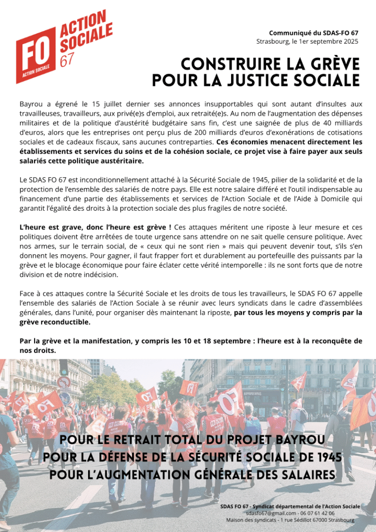 Fédération Nationale Action Sociale Force OuvrièreVie syndicaleVie syndicalerésistanceConstruire la grève pour la justice sociale – SDAS FO 67 Le 1er septembre 2025 Sur le même sujet9 janvier 2026évenementsLe 22 janvier l’Assemblée nationale doit rejeter l’attaque du 1er mai, seul jour obligatoirement chômé et payé5 janvier 2026évenementsFO condamne l’agression contre le Venezuela : le droit international n’est pas à géométrie variable !1er janvier 2026évenementsvoeux 2026Tous les articles