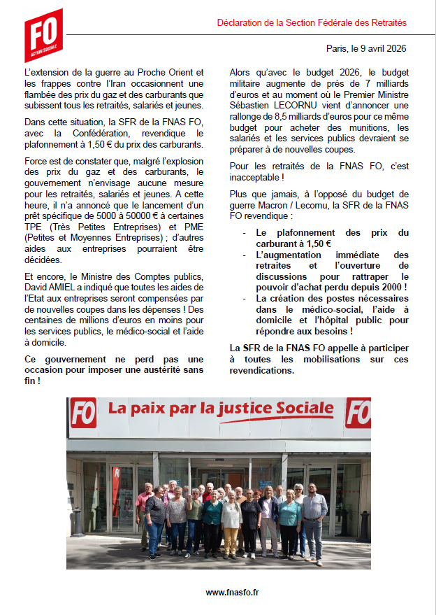 AccueilVie syndicaleVie syndicaleretraitésDéclaration de la Section Fédérale des Retraités Le 9 avril 2026 Sur le même sujet29 avril 2026évenements26ème Congrès Confédéral de DIJON – Résolutions Adoptées –28 avril 2026évenements28 AVRIL 2026 JOURNÉE MONDIALE DE LA SANTÉ AU TRAVAIL27 avril 2026évenementsSuite du Congrès FO : élection des instances confédéralesTous les articles