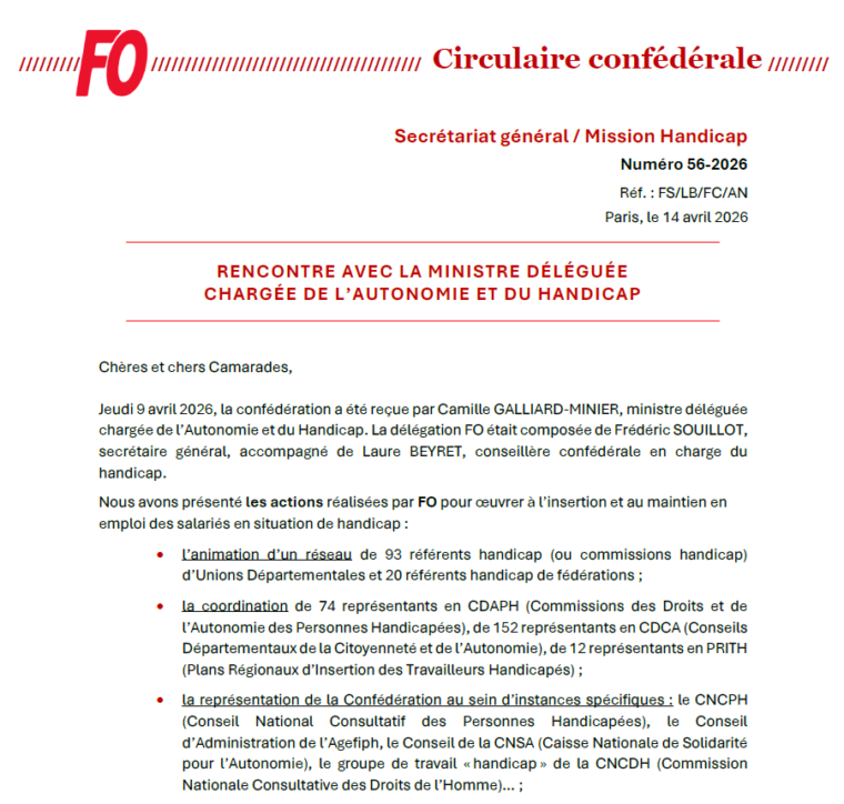 AccueilVie syndicaleVie syndicaleévenementsRencontre avec la ministre déléguée chargée de l’autonomie et du handicap …… Le 9 avril 2026 Sur le même sujet29 avril 2026évenements26ème Congrès Confédéral de DIJON – Résolutions Adoptées –28 avril 2026évenements28 AVRIL 2026 JOURNÉE MONDIALE DE LA SANTÉ AU TRAVAIL27 avril 2026évenementsSuite du Congrès FO : élection des instances confédéralesTous les articles