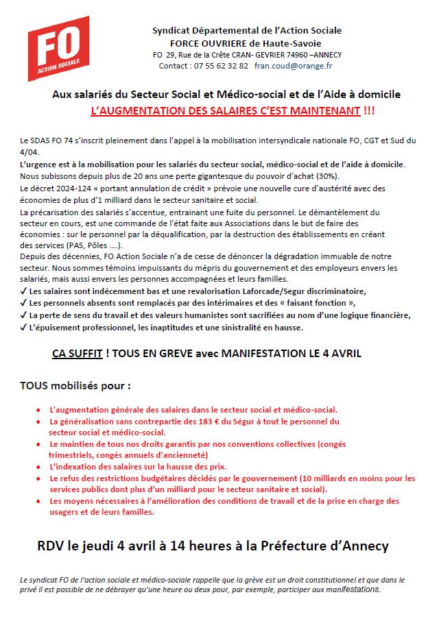 AccueilVie syndicaleVie syndicalerésistanceSDAS 74 : APPEL A LA GRèVE LE 4 AVRIL Le 26 mars 2024 Sur le même sujet29 avril 20261er mai – Pain, Paix, Liberté29 avril 2026évenements26ème Congrès Confédéral de DIJON – Résolutions Adoptées –28 avril 2026évenements28 AVRIL 2026 JOURNÉE MONDIALE DE LA SANTÉ AU TRAVAILTous les articles